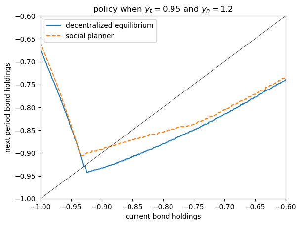 Now let’s compute borrowing for the decentralized equilibrium and the planner.